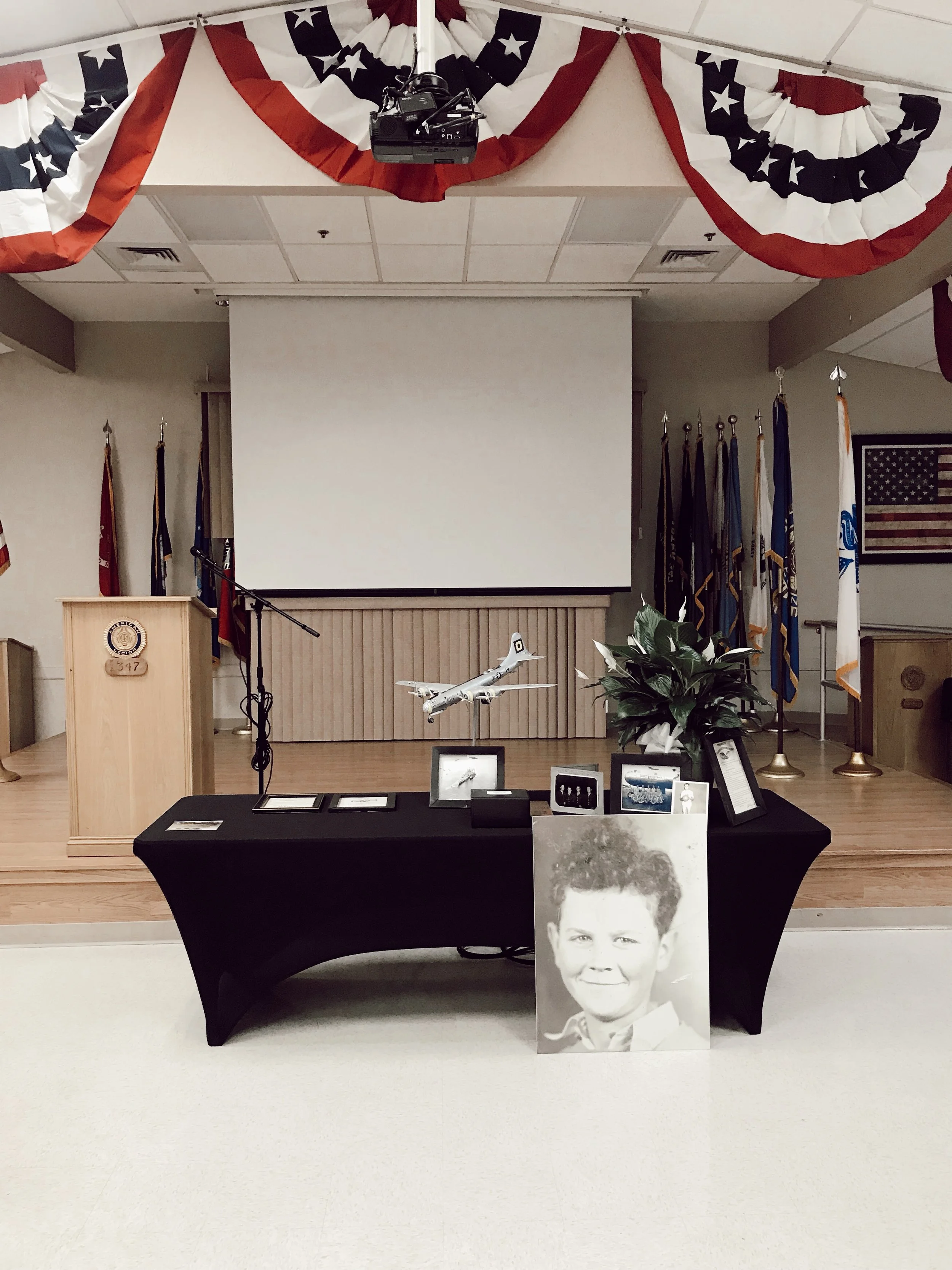 At 11:33a airplanes flew out of the north and over The American Legion. The biplane broke from the formation and headed away to the west trailing smoke — a spectacular and proper observance for a bombardier of the 20th Air Force. Grandpa’s tour of duty lasted six months and 26 days. He flew 30 combat missions over Japan resulting in 428 combat hours.